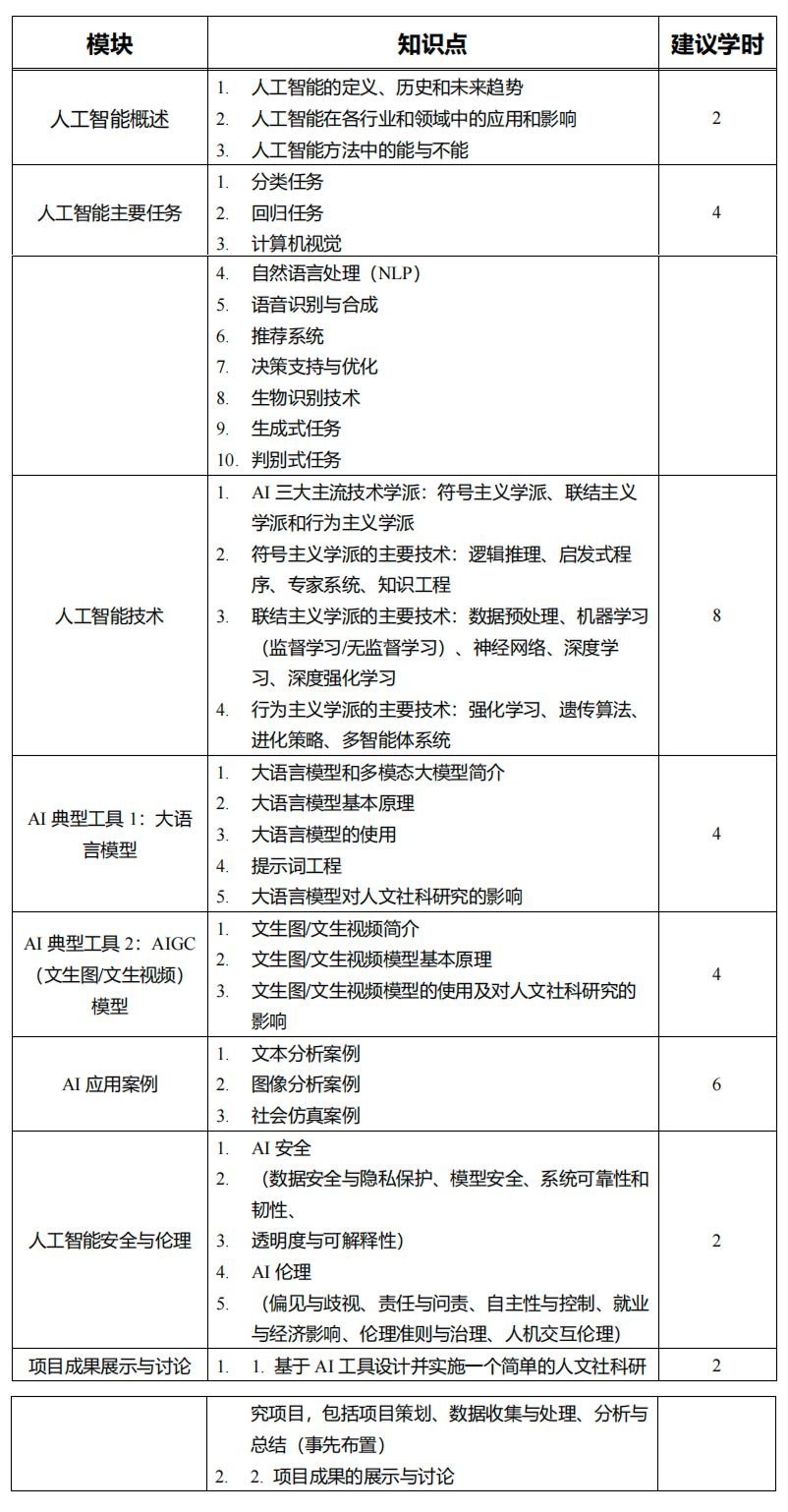 此外,本课程还注重培养学生利用人工智能工具分析和解决人文社科领域实际问题的能力。通过案例分析和项目实践,学生将学会如何将人工智能技术与人文社科研究相结合,提高研究的效率和质量,同时也能够更好地理解和解决社会实践中遇到的问题,为他们在未来深入学习相关专业课程和从事“人工智能+”研究打下坚实基础。