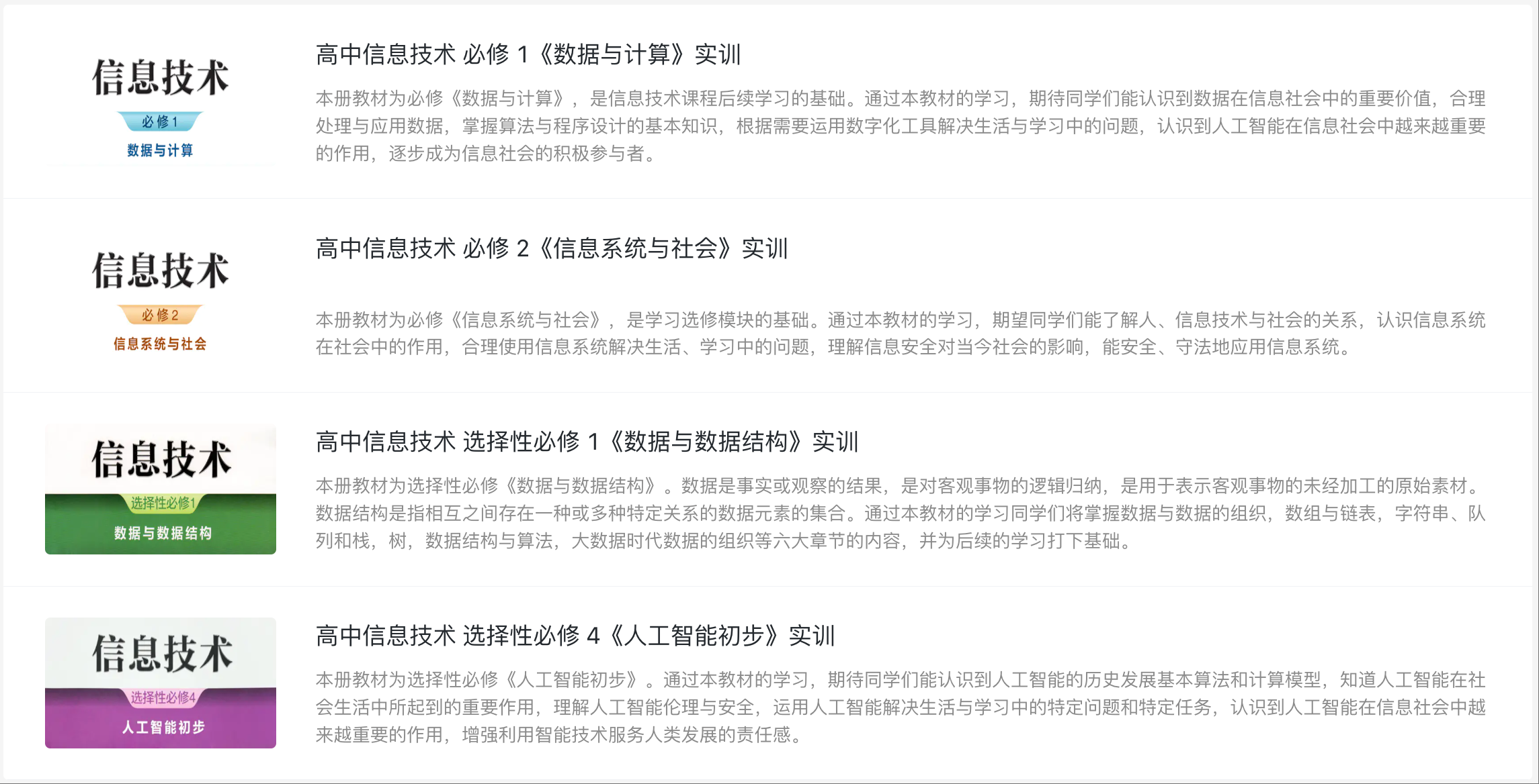 高中人工智能课程与浙江教育出版集团合作,将新课标教材做独家电子化和在线化,重新梳理了新课标课程内容痛点,重新设计学练结合的课程内容,帮助学生更好理解知识;提供即刻上手低门槛的学习编程环境,克服环境部署难这道“拦路虎”;提供丰富且持续更新的课后学习资源,解决教学资源质量低下的烦恼。