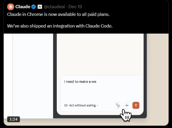 Anthropic于12月22日正式宣布,Claude Chrome扩展插件现已向所有Claude Pro、Team、Enterprise付费用户全面开放,无需排队、无需申请。这款被誉为“浏览器里最强的Claude助手”的插件,彻底改变了AI与网页交互的方式,让付费用户可以直接在浏览器侧边栏调用Claude,完成几乎所有浏览器内任务。
