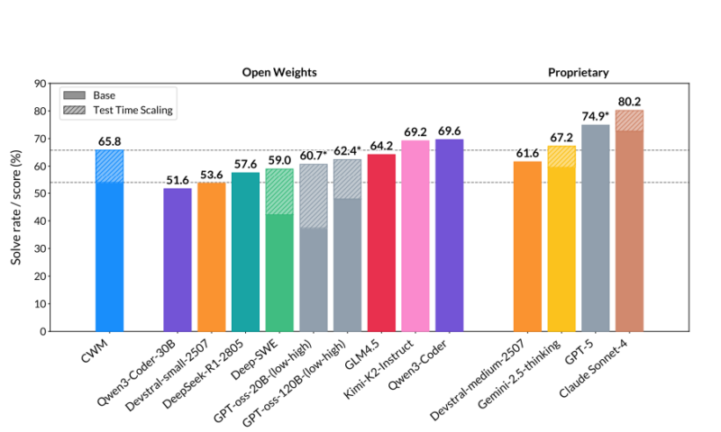 在实际应用中,CWM 展现出了优秀的性能。在多个行业基准测试中,它的表现均超过了其他同类模型。例如,在 SWE-bench Verified 基准测试中,CWM 的通过率达到了65.8%,在 LiveCodeBench 和数学推理等测试中也取得了优异的成绩。虽然 CWM 的表现令人鼓舞,但研究人员也提醒,CWM 仍然处于研究阶段,未进行大规模的优化,暂不适用于通用的对话助手功能。